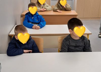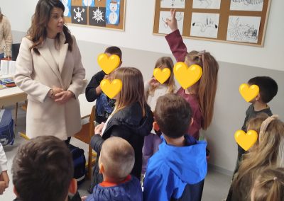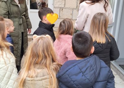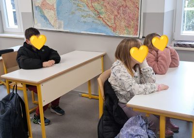 Na ulazu škole dočekala nas je učiteljica razredne nastave Ivana Kunjašić koja nas je provela cijelom školom i svim učionicama. Budući prvašići su imali priliku upoznati se s prostorom škole, sjediti u klupama, družiti se s učenicima i učiteljicama. Djeci je posebno lijepo bilo vidjeti braću i sestre školarce te neke prošlogodišnje vrtićke prijatelje koji sada već ponosno sjede u školskim klupama. Učenici 4. razreda pripremili su kratki program dobrodošlice za naše predškolce, dok su oni kao pravi budući đaci spremno sjeli u školske klupe i pozorno ih slušali.